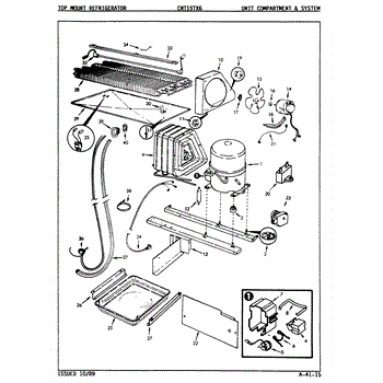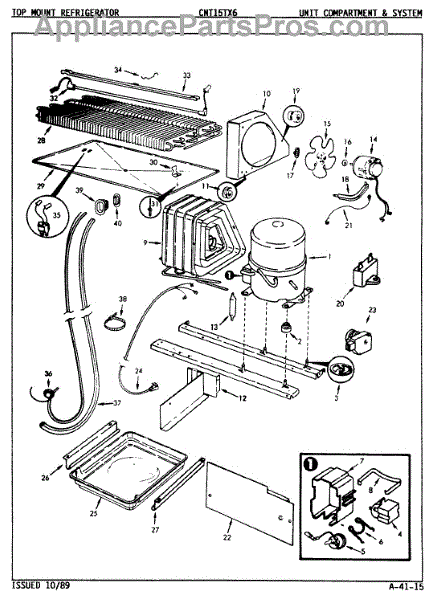 Plastic defrost pan. Evaporator pan hangs from side rails and rests on compressor.
