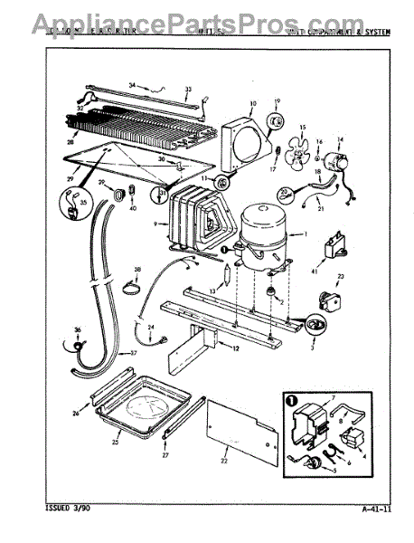 Plastic defrost pan. Evaporator pan hangs from side rails and rests on compressor.