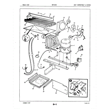 Plastic defrost pan. Evaporator pan hangs from side rails and rests on compressor.