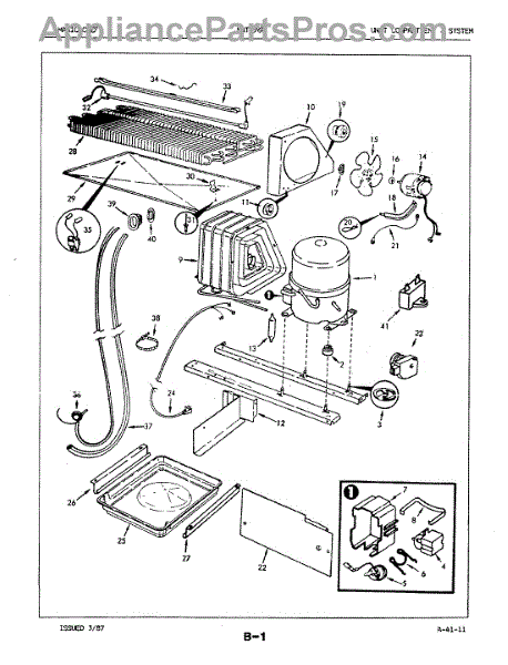 Plastic defrost pan. Evaporator pan hangs from side rails and rests on compressor.
