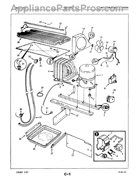 Plastic defrost pan. Evaporator pan hangs from side rails and rests on compressor.