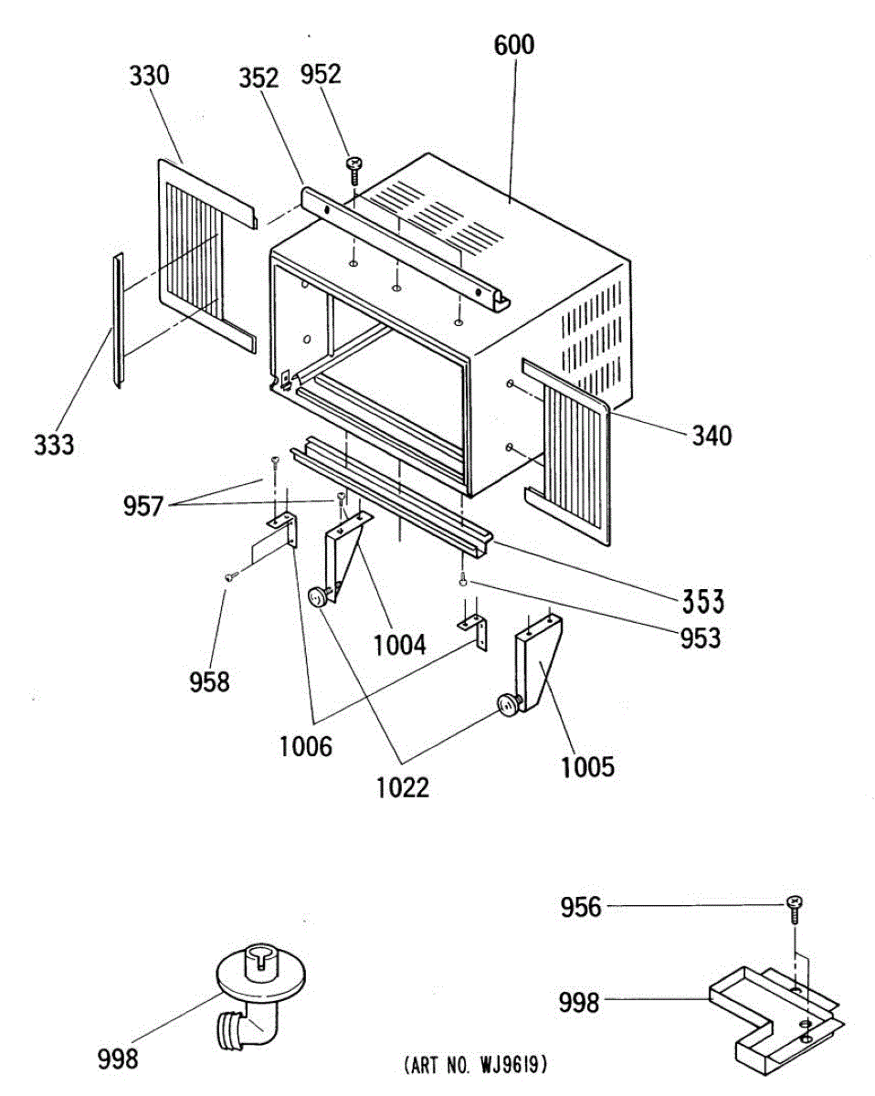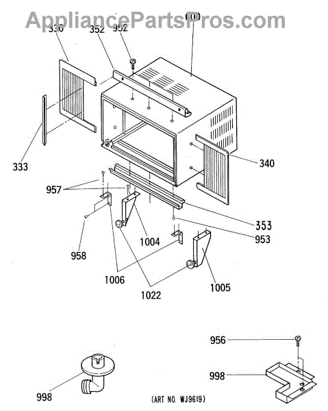 Mounting screw for air conditioner installation. Secures unit to window frame or bracket. Replace if stripped, missing, or corroded during maintenance.