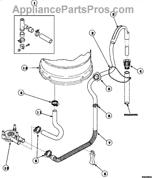 Connects washer drain hose to household standpipe for a secure seal. Replace if cracked, stripped threads, or causing splashing at the drain connection.