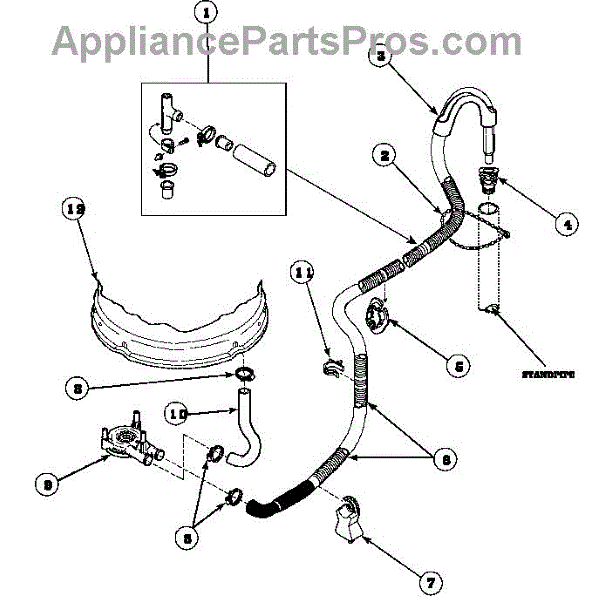 This standpipe adapter connects the appliance drain hose to the household standpipe or waste outlet, helping ensure a secure drain path and reduce the risk of leaks or poor drainage. Simple replacement for damaged or worn connectors. What it does: