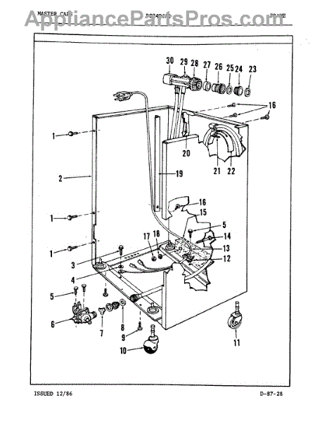 This factory screw secures appliance components to their mounting points. Replace missing, worn, or stripped hardware to restore a tight fit, proper alignment, and quieter operation across the affected assembly.