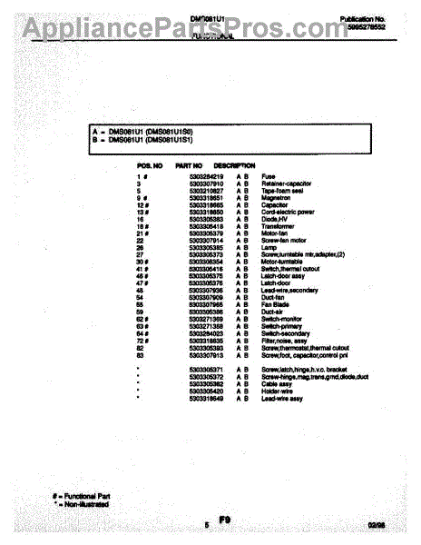 Parts for Frigidaire DMS081U1S0: 05 - Functional Parts