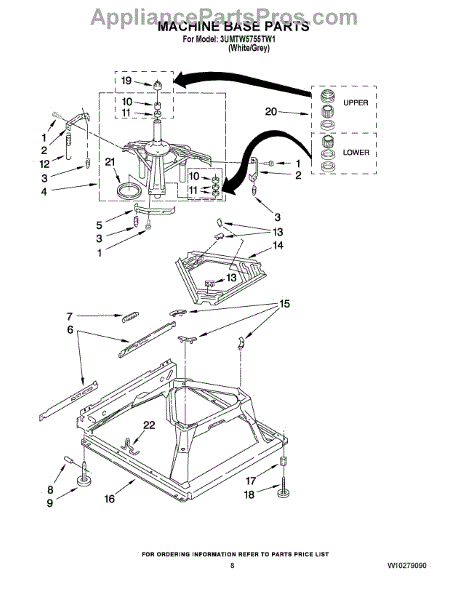 Used for direct drive washing machines. Complete assembly includes 2 level mechanism links, 1 level mechanism spring, 1 knurled pin, 2 rear feet, 1 pad plate, 1 suspension plate, 1 base pad, and 1 suspension spring retainer.