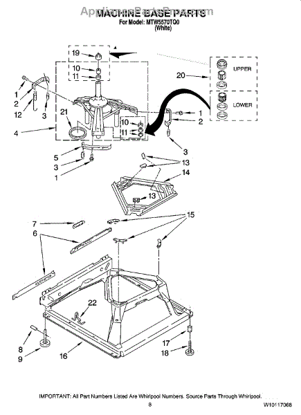 Used for direct drive washing machines. Complete assembly includes 2 level mechanism links, 1 level mechanism spring, 1 knurled pin, 2 rear feet, 1 pad plate, 1 suspension plate, 1 base pad, and 1 suspension spring retainer.