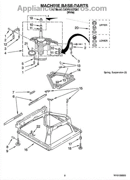 Used for direct drive washing machines. Complete assembly includes 2 level mechanism links, 1 level mechanism spring, 1 knurled pin, 2 rear feet, 1 pad plate, 1 suspension plate, 1 base pad, and 1 suspension spring retainer.