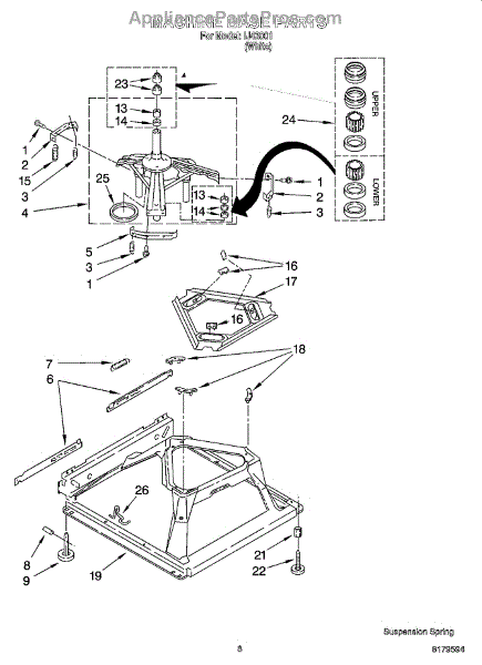 Used for direct drive washing machines. Complete assembly includes 2 level mechanism links, 1 level mechanism spring, 1 knurled pin, 2 rear feet, 1 pad plate, 1 suspension plate, 1 base pad, and 1 suspension spring retainer.
