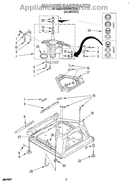 Supports the spin basket on the center post for smooth, quiet rotation. Replace if your washer is noisy, vibrating excessively, or has poor spin performance.