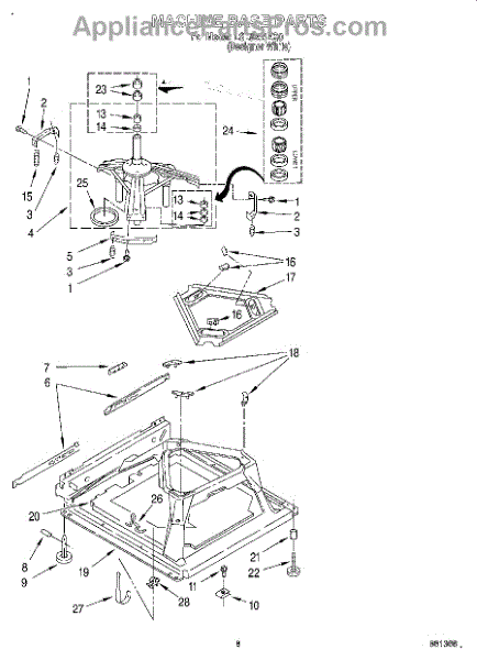Used for direct drive washing machines. Complete assembly includes 2 level mechanism links, 1 level mechanism spring, 1 knurled pin, 2 rear feet, 1 pad plate, 1 suspension plate, 1 base pad, and 1 suspension spring retainer.