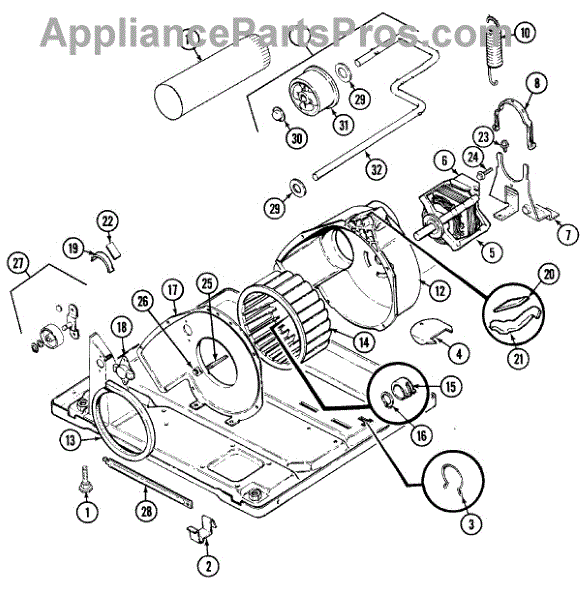 This dryer exhaust fan is used on some Admiral, Crosley, Hoover, Magic Chef, Maytag, Montgomery Ward and Norge brands. Size: 3-1/8 inches deep, 7 1/2 inch fin diameter, 6 3/4 inch hub diameter, 20 standard fins, 1/2 inch diameter motor shaft, 7/16 inch diameter motor shaft to flat side of shaft. Blower wheel clamp not included. For the clamp order 25-7855.