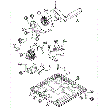 This dryer blower housing encloses the blower wheel and directs air from the drum through the lint filter to the exhaust vent. Replacing a damaged housing restores proper airflow for consistent drying and helps keep lint contained within the airflow path.