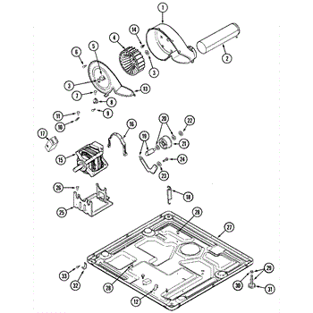 This dryer blower housing encloses the blower wheel and directs air from the drum through the lint filter to the exhaust vent. Replacing a damaged housing restores proper airflow for consistent drying and helps keep lint contained within the airflow path.