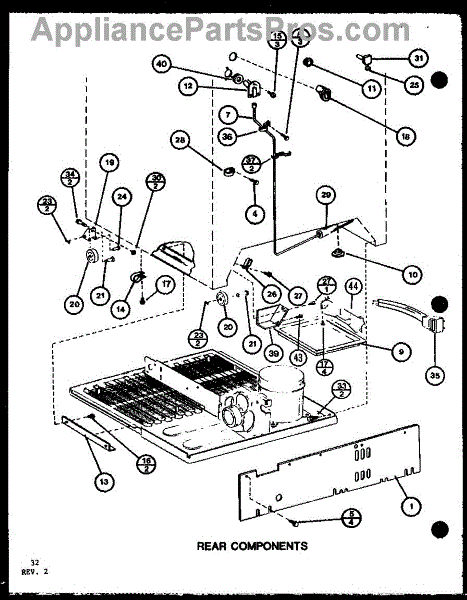 This factory screw secures appliance components to their mounting points. Replace missing, worn, or stripped hardware to restore a tight fit, proper alignment, and quieter operation across the affected assembly.
