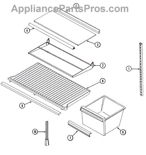 The crisper shelf center support stabilizes the pan cover above the crisper drawers to keep it level under load. Replace a cracked or missing support to restore proper shelf alignment and smooth crisper drawer operation.