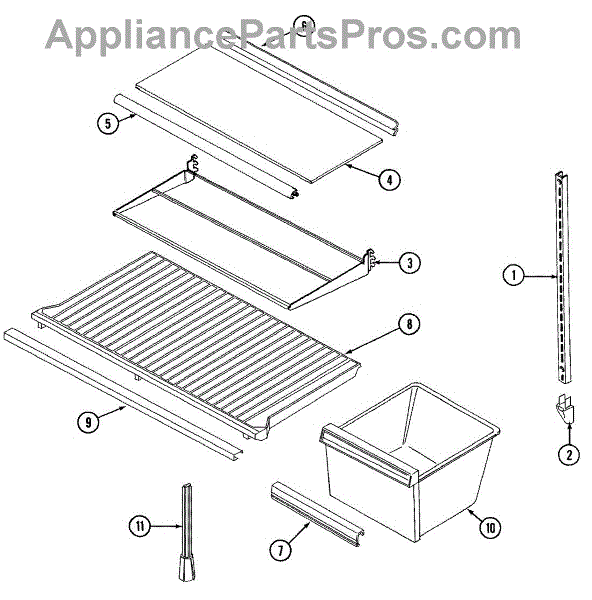 The crisper shelf center support stabilizes the pan cover above the crisper drawers to keep it level under load. Replace a cracked or missing support to restore proper shelf alignment and smooth crisper drawer operation.