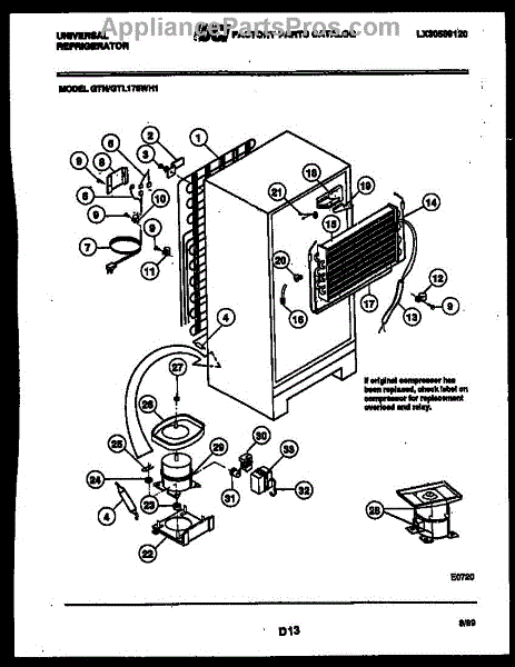 This is a compressor used in several types of home appliances. The compressor is designed to take cold gas in the appliance and place it under pressure so the gas raises in temperature. It is then moved through the refrigerator system to ensure the unit stays cold throughout the appliance. This part can become damaged or malfunction, which may cause the motor to stop running, make the motor noisier, or cause the motor to never stop running.If this happens, the compressor will need to be replaced. A basic set of tools will be needed. A pair of work gloves can also be useful. First, locate the compressor as it may be in various locations depending on the appliance model. Unplug the appliance before removing the compressor. Install the new compressor using the original bolts and nuts before turning the power back on and resuming normal use.This part is sold on an individual basis. The compressor is made to be used with refrigerators, ranges, stoves, ovens, air conditioners, and freezers created by Gibson, Frigidaire, Kelvinator, Montgomery Wards, Westinghouse, Tappan, JCPenney, Universal, and Kenmore. It is an authentic OEM replacement part directly sourced from the manufacturer.