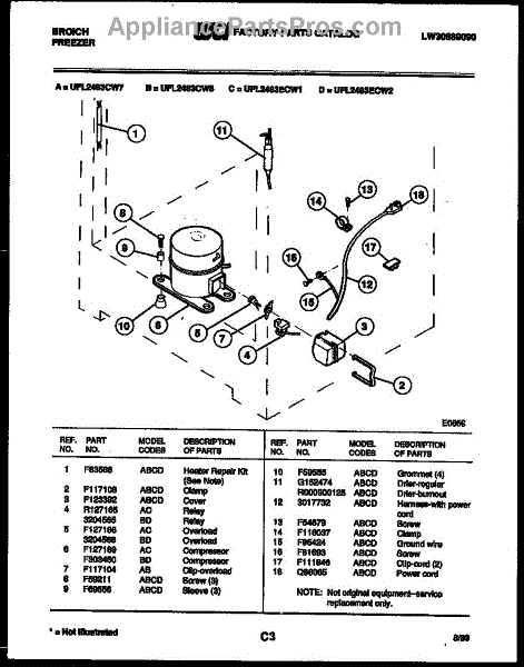 This is a compressor used in several types of home appliances. The compressor is designed to take cold gas in the appliance and place it under pressure so the gas raises in temperature. It is then moved through the refrigerator system to ensure the unit stays cold throughout the appliance. This part can become damaged or malfunction, which may cause the motor to stop running, make the motor noisier, or cause the motor to never stop running.If this happens, the compressor will need to be replaced. A basic set of tools will be needed. A pair of work gloves can also be useful. First, locate the compressor as it may be in various locations depending on the appliance model. Unplug the appliance before removing the compressor. Install the new compressor using the original bolts and nuts before turning the power back on and resuming normal use.This part is sold on an individual basis. The compressor is made to be used with refrigerators, ranges, stoves, ovens, air conditioners, and freezers created by Gibson, Frigidaire, Kelvinator, Montgomery Wards, Westinghouse, Tappan, JCPenney, Universal, and Kenmore. It is an authentic OEM replacement part directly sourced from the manufacturer.