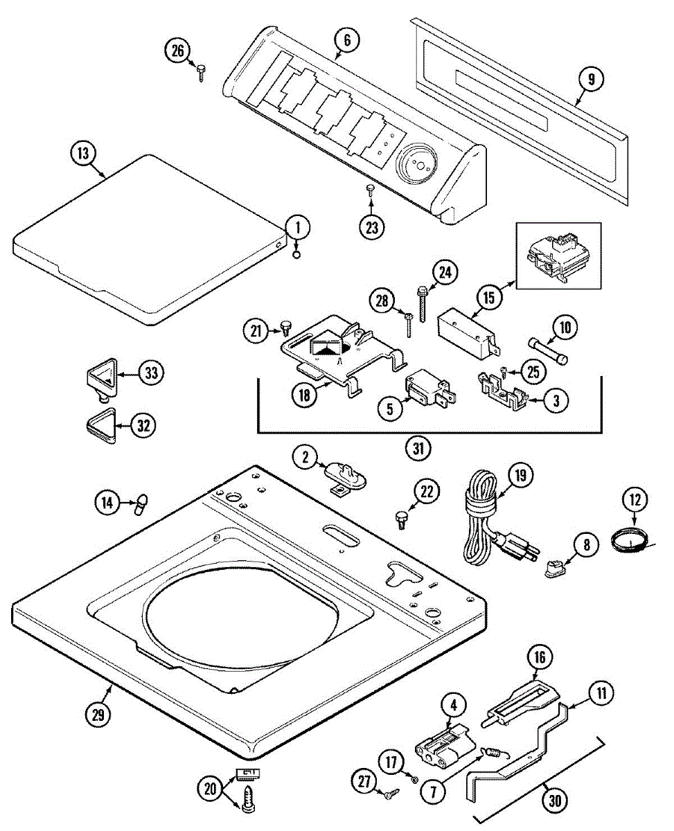 Bracket assembly that secures the lid switch and thermal fuse in your washer. Replace if the mounting bracket is cracked, broken, or missing components.