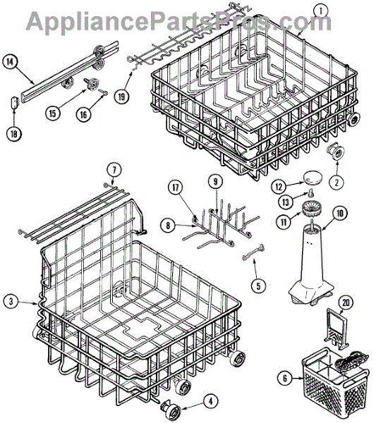 This is an upper dish rack assembly for dishwashers. It is located in the top section of the dishwasher and is meant to ensure dishes stay in place while the dishwasher is running. The dish rack assembly is durable but can experience damage, stains, or other issues. This may make it unsuitable for holding dishes in the appliance. If the part is damaged or malfunctioning, it should be replaced with a new part.This is a simple replacement that takes only a few minutes to complete. First, open up the dishwasher. Remove the bottom rack if desired to create more room to work with the upper dish rack assembly. Take a small flathead screwdriver and use it to release the retaining tabs located on the stop clips. Remove the stop clips and the old dish rack assembly will slide out. Align the new assembly and slide it into place before reassembling other small parts.This upper dish rack assembly is used as an authentic OEM replacement part for dishwashers manufactured by Maytag, Norge, Jenn Air, Admiral, Amana, Crosley, and Magic Chef. The part is sold as an individual component.