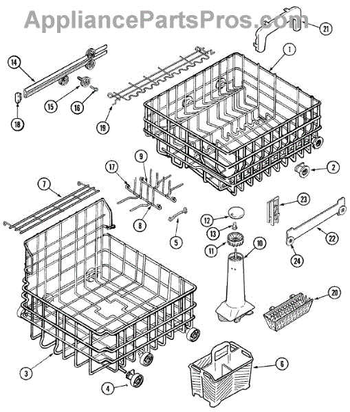 This is an upper dish rack assembly for dishwashers. It is located in the top section of the dishwasher and is meant to ensure dishes stay in place while the dishwasher is running. The dish rack assembly is durable but can experience damage, stains, or other issues. This may make it unsuitable for holding dishes in the appliance. If the part is damaged or malfunctioning, it should be replaced with a new part.This is a simple replacement that takes only a few minutes to complete. First, open up the dishwasher. Remove the bottom rack if desired to create more room to work with the upper dish rack assembly. Take a small flathead screwdriver and use it to release the retaining tabs located on the stop clips. Remove the stop clips and the old dish rack assembly will slide out. Align the new assembly and slide it into place before reassembling other small parts.This upper dish rack assembly is used as an authentic OEM replacement part for dishwashers manufactured by Maytag, Norge, Jenn Air, Admiral, Amana, Crosley, and Magic Chef. The part is sold as an individual component.