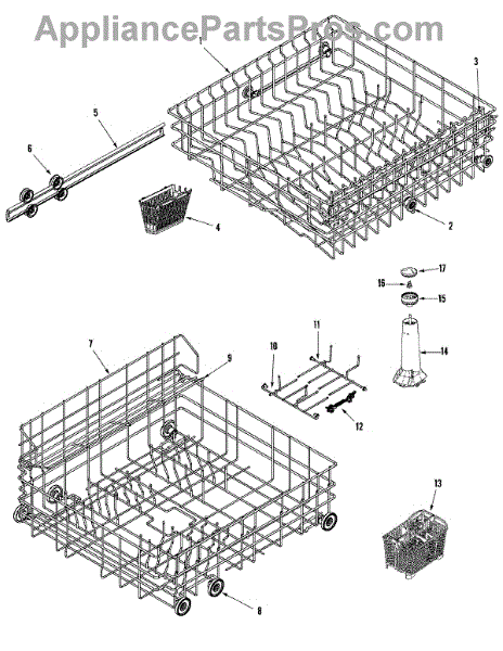 This is an upper dish rack assembly for dishwashers. It is located in the top section of the dishwasher and is meant to ensure dishes stay in place while the dishwasher is running. The dish rack assembly is durable but can experience damage, stains, or other issues. This may make it unsuitable for holding dishes in the appliance. If the part is damaged or malfunctioning, it should be replaced with a new part.This is a simple replacement that takes only a few minutes to complete. First, open up the dishwasher. Remove the bottom rack if desired to create more room to work with the upper dish rack assembly. Take a small flathead screwdriver and use it to release the retaining tabs located on the stop clips. Remove the stop clips and the old dish rack assembly will slide out. Align the new assembly and slide it into place before reassembling other small parts.This upper dish rack assembly is used as an authentic OEM replacement part for dishwashers manufactured by Maytag, Norge, Jenn Air, Admiral, Amana, Crosley, and Magic Chef. The part is sold as an individual component.