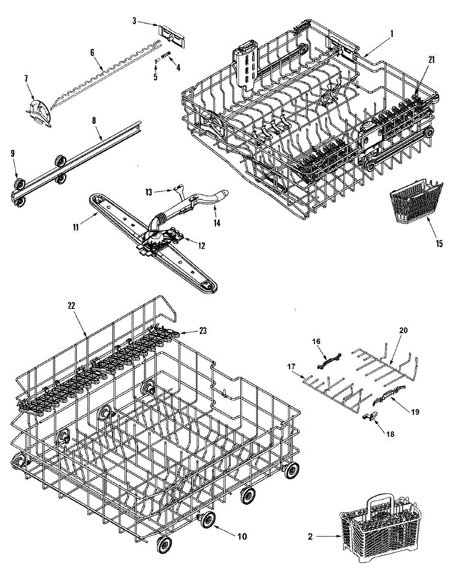 Note: New rack no longer includes removable tines or cup shelf. This part is a lower dishrack. The lower dishrack is the lower shelf of a dishwasher that holds plates, bowls, and utensils. To remove the old dishrack, simply pull it out and lift the wheels up from its track. Set it off the side, and lift the new dishrack. Slide it into its track and make sure it is locked in. If it is gliding in and out in a smooth way, it has been installed properly.This genuine replacement OEM part is sold individually and is compatible with Whirlpool brands include Whirlpool, Maytag, KitchenAid, Jenn-Air, Amana, Magic Chef, Admiral, Norge, Roper, and Sears/Kenmore brand appliances.