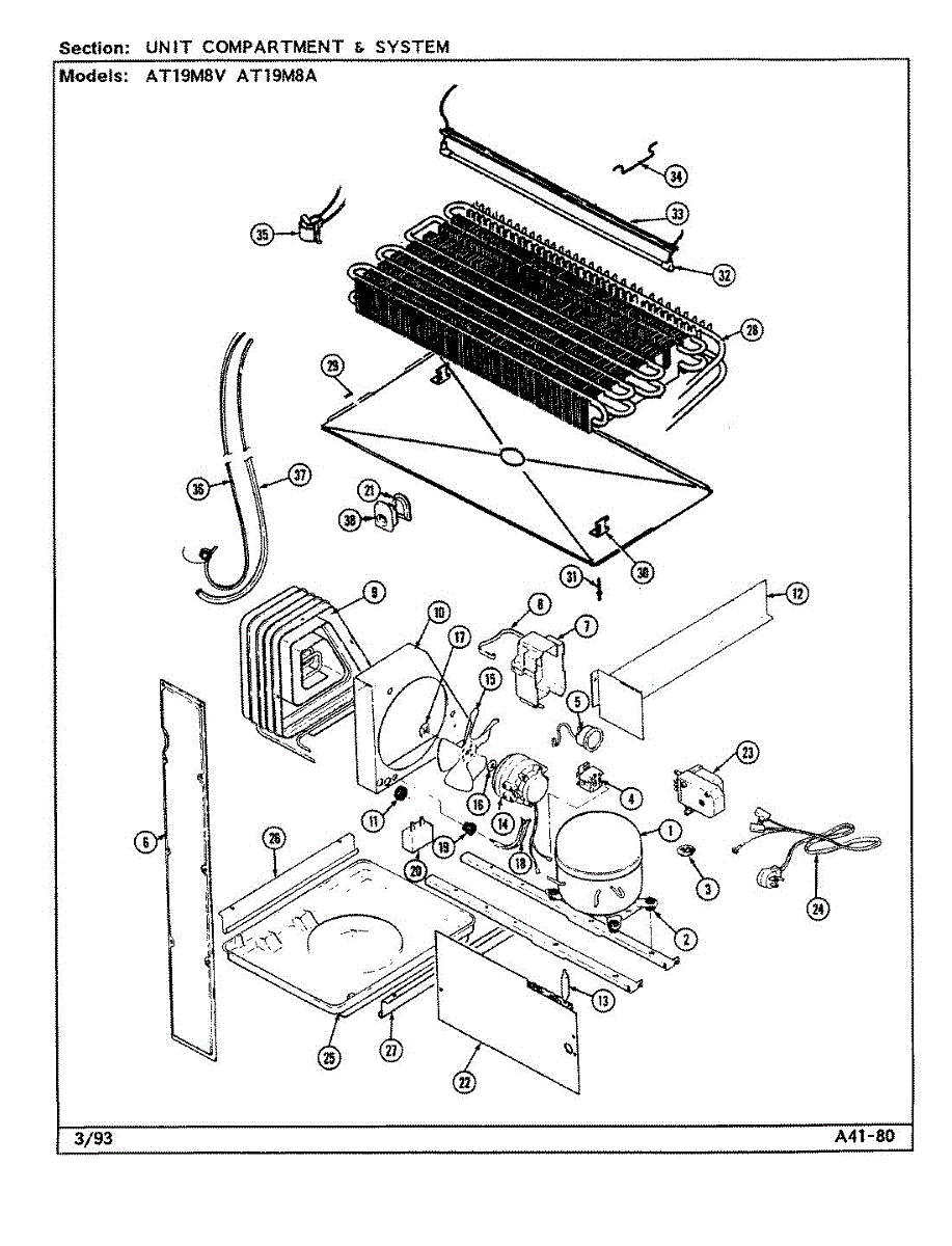 Plastic defrost pan. Evaporator pan hangs from side rails and rests on compressor.