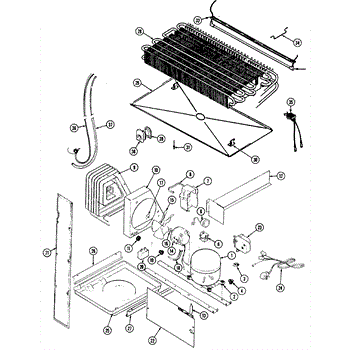 Plastic defrost pan. Evaporator pan hangs from side rails and rests on compressor.