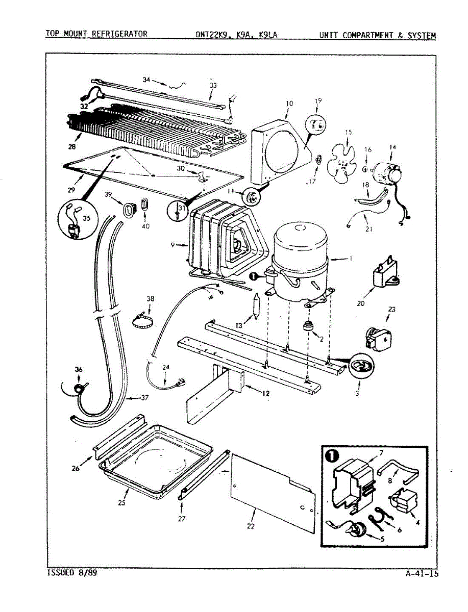 Plastic defrost pan. Evaporator pan hangs from side rails and rests on compressor.