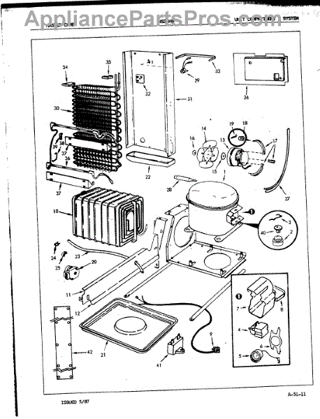 Plastic defrost pan. Evaporator pan hangs from side rails and rests on compressor.