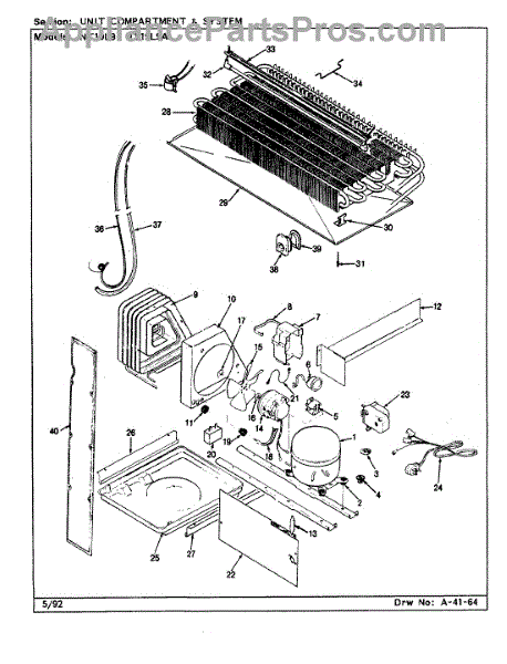 Plastic defrost pan. Evaporator pan hangs from side rails and rests on compressor.