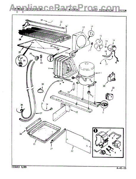 Plastic defrost pan. Evaporator pan hangs from side rails and rests on compressor.