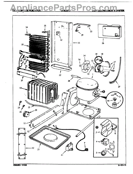 Plastic defrost pan. Evaporator pan hangs from side rails and rests on compressor.