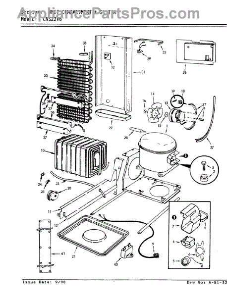 Plastic defrost pan. Evaporator pan hangs from side rails and rests on compressor.