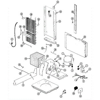 Plastic defrost pan. Evaporator pan hangs from side rails and rests on compressor.