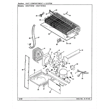Plastic defrost pan. Evaporator pan hangs from side rails and rests on compressor.