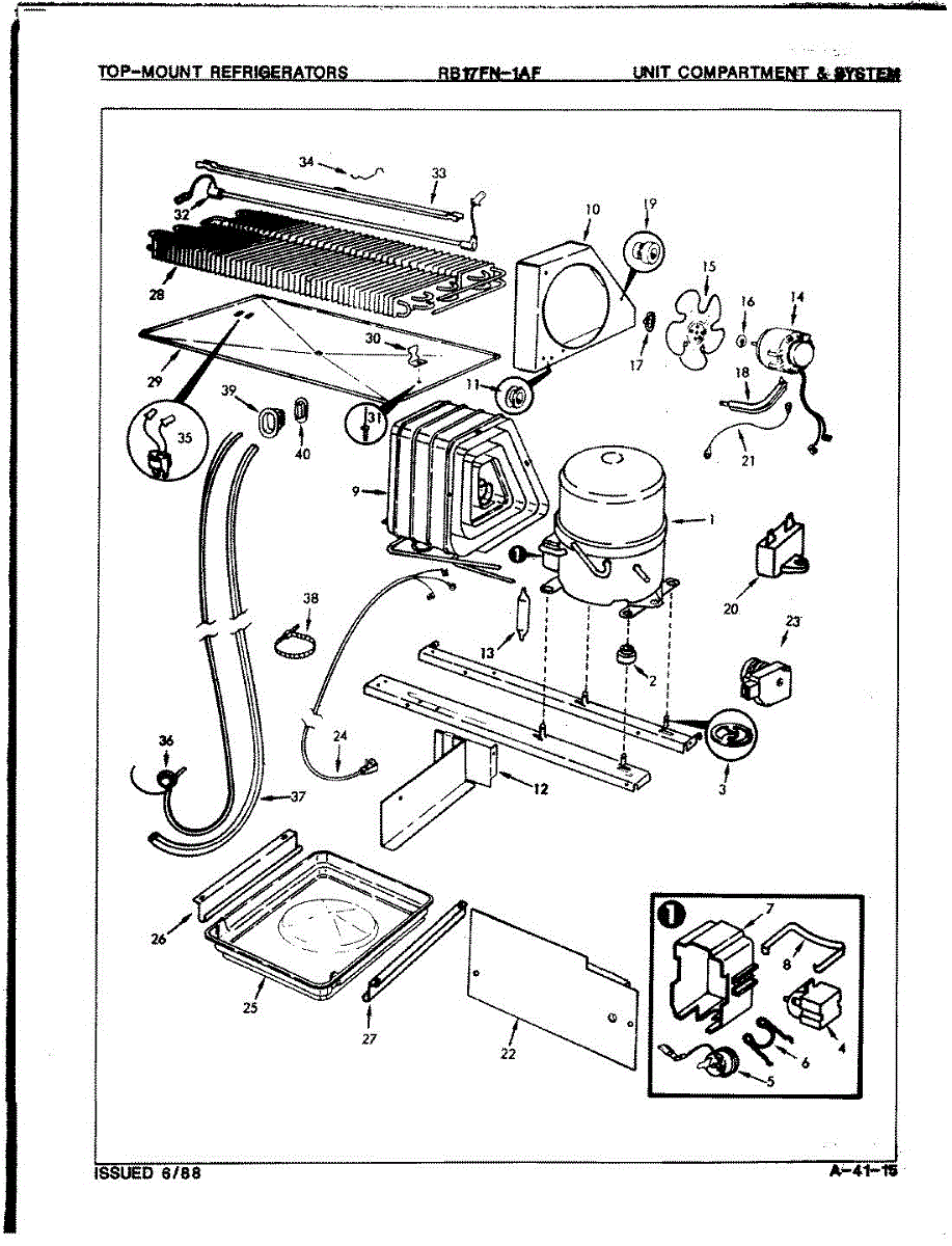 Plastic defrost pan. Evaporator pan hangs from side rails and rests on compressor.