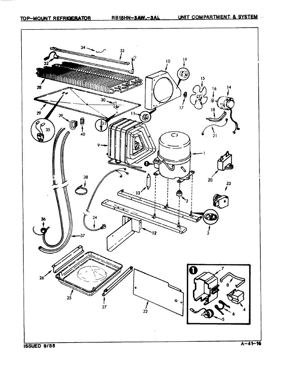 Plastic defrost pan. Evaporator pan hangs from side rails and rests on compressor.