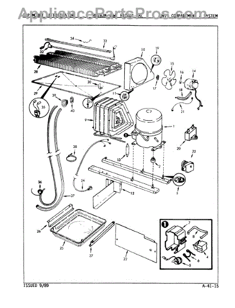 Plastic defrost pan. Evaporator pan hangs from side rails and rests on compressor.