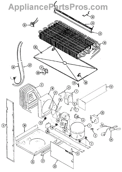 Plastic defrost pan. Evaporator pan hangs from side rails and rests on compressor.