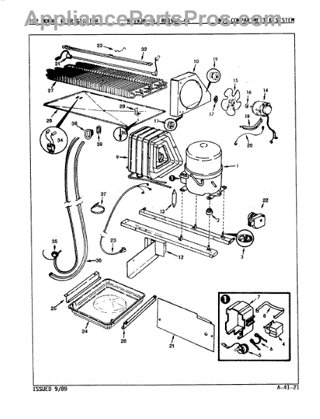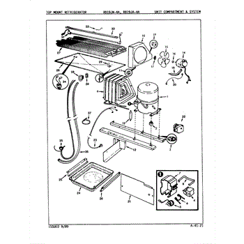 Plastic defrost pan. Evaporator pan hangs from side rails and rests on compressor.