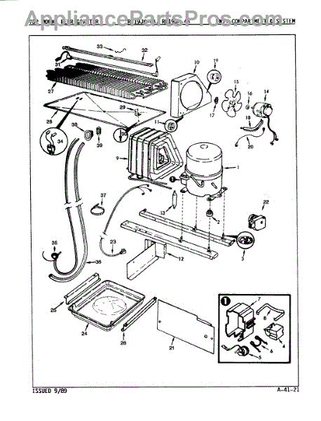 Plastic defrost pan. Evaporator pan hangs from side rails and rests on compressor.