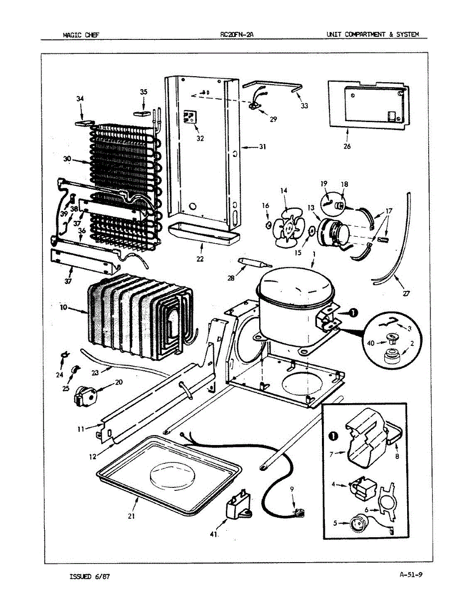 Plastic defrost pan. Evaporator pan hangs from side rails and rests on compressor.