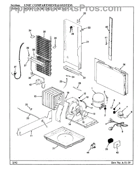 Plastic defrost pan. Evaporator pan hangs from side rails and rests on compressor.