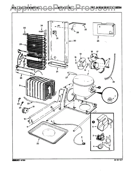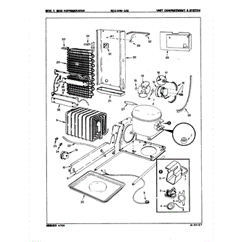 Plastic defrost pan. Evaporator pan hangs from side rails and rests on compressor.