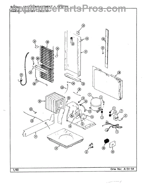 Plastic defrost pan. Evaporator pan hangs from side rails and rests on compressor.