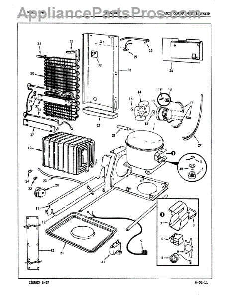 Plastic defrost pan. Evaporator pan hangs from side rails and rests on compressor.